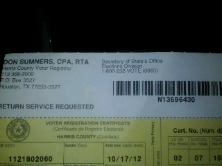 It took long enough. I had to send in for an address change (in early summer) and for a while I thought it wouldn't come in time. You know how it's been with the voter fraud scares, intimidation, and bullsh..crap. Whew, don't want any drama when I go and vote for Obama.Do I want to give this man another chance at fixing my country because he is Black? Read this argument in a paper, too funny. Why would people assume Black people only chose their own? It has been tradition we are the worst when it comes to supporting each other as a race. Where do you think 'crabs in a bucket' metaphor was born?